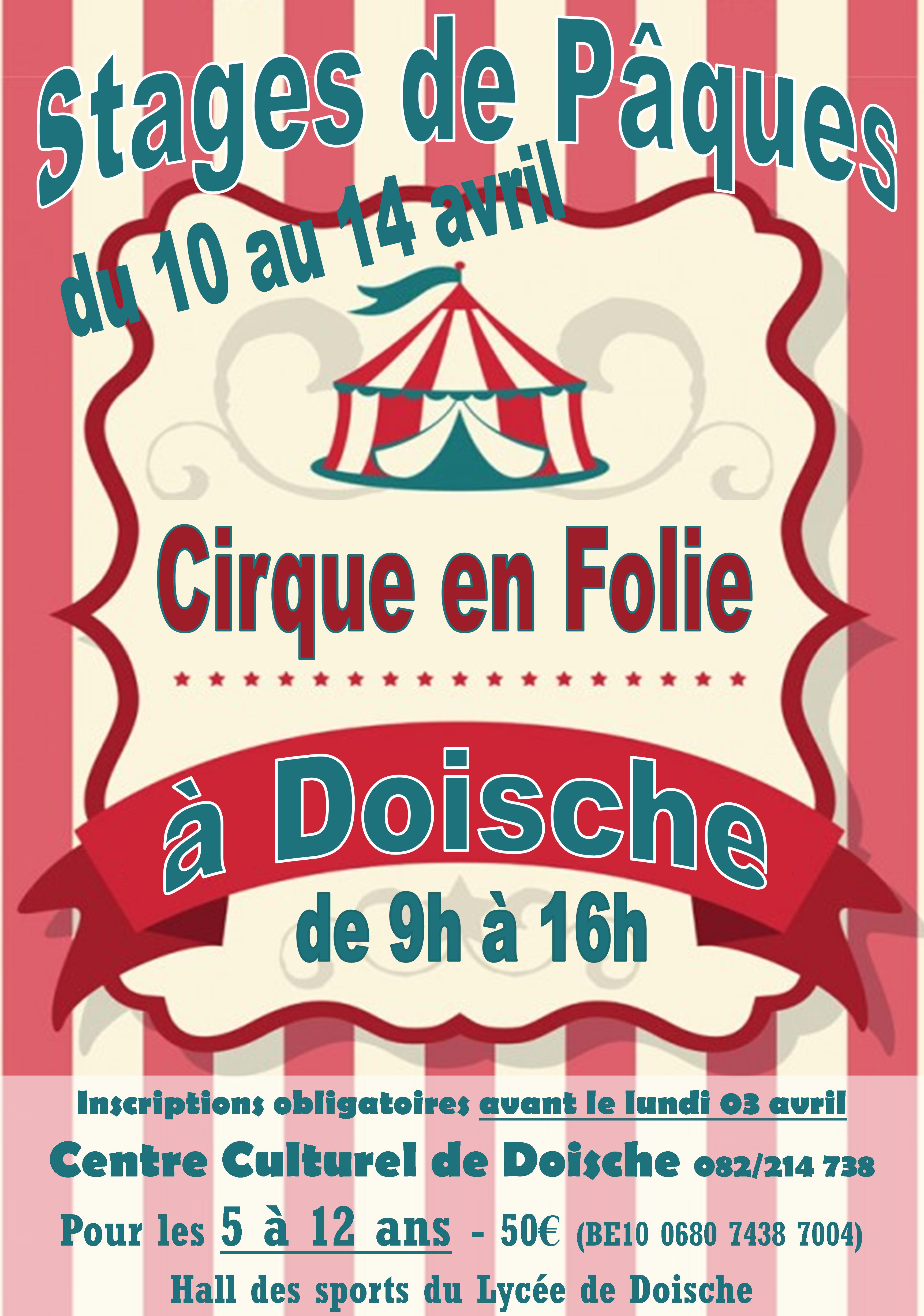 Stages de Pâques 2017 Publié parCentre culturel de Doische1 mars 2017Publié dansAnimations, Évènements, Stages & Ateliers, Centre culturelÉtiquettes :2017, cirque, Doische, Stage de Pâques, Stages pour enfants J’aime chargement… Sur le même thème