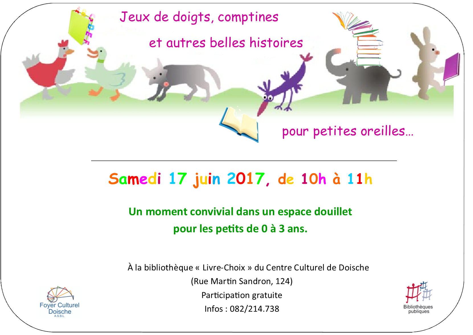 Jeux de Doigts, comptines et autres belles histoires Publié parCentre culturel de Doische1 juin 2017Publié dansAnimations, BibliothèqueÉtiquettes :Animation, Touts-petits J’aime chargement… Sur le même thème