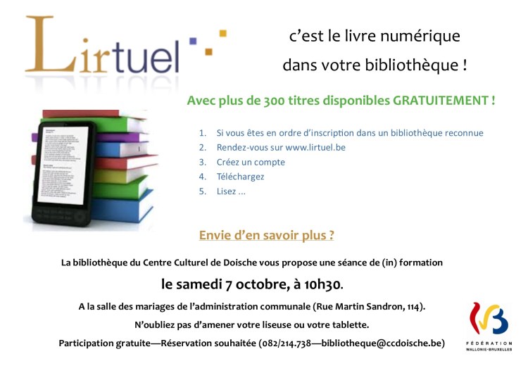 Séance d’information sur Lirtuel le 07 octobre Publié parCentre culturel de Doische25 août 201725 août 2017Publié dansAnimations, BibliothèqueÉtiquettes :Lirtuel, Séance d'information J’aime chargement… Sur le même thème