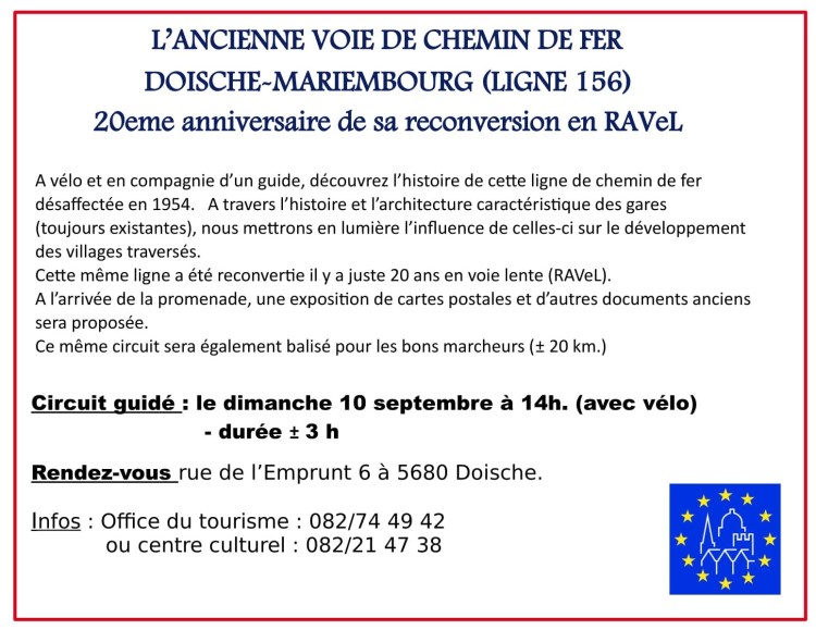 Dans le cadre des Journées du Patrimoine 2017, le centre culturel et l’office du tourisme de Doische vous propose de parcourir l’ancienne voie de chemin de fer (Doische-Mariembourg (ligne 156)) transformée en RAVeL il y a tout juste 20 ans.