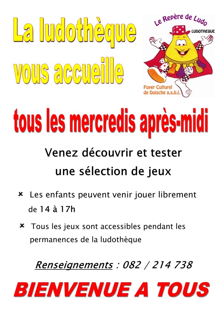 Accueil de la ludothèque tous les mercredis après-midi Publié parCentre culturel de Doische30 Mai 20186 juin 2018Publié dansAnimations de Ludo, Ludothèque J’aime chargement… Sur le même thème