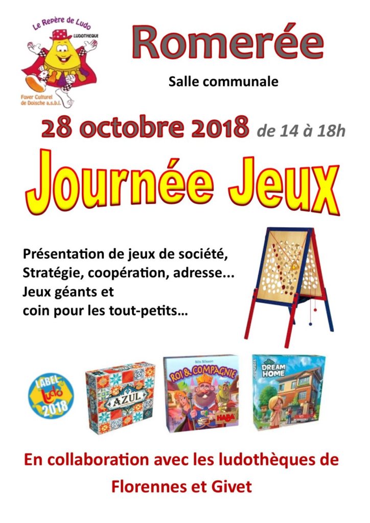 Les ludothèques de Givet, de Florennes et le Repère de Ludo vous accueillent ce samedi 28 octobre dès 14h à la salle communale de Romerée.