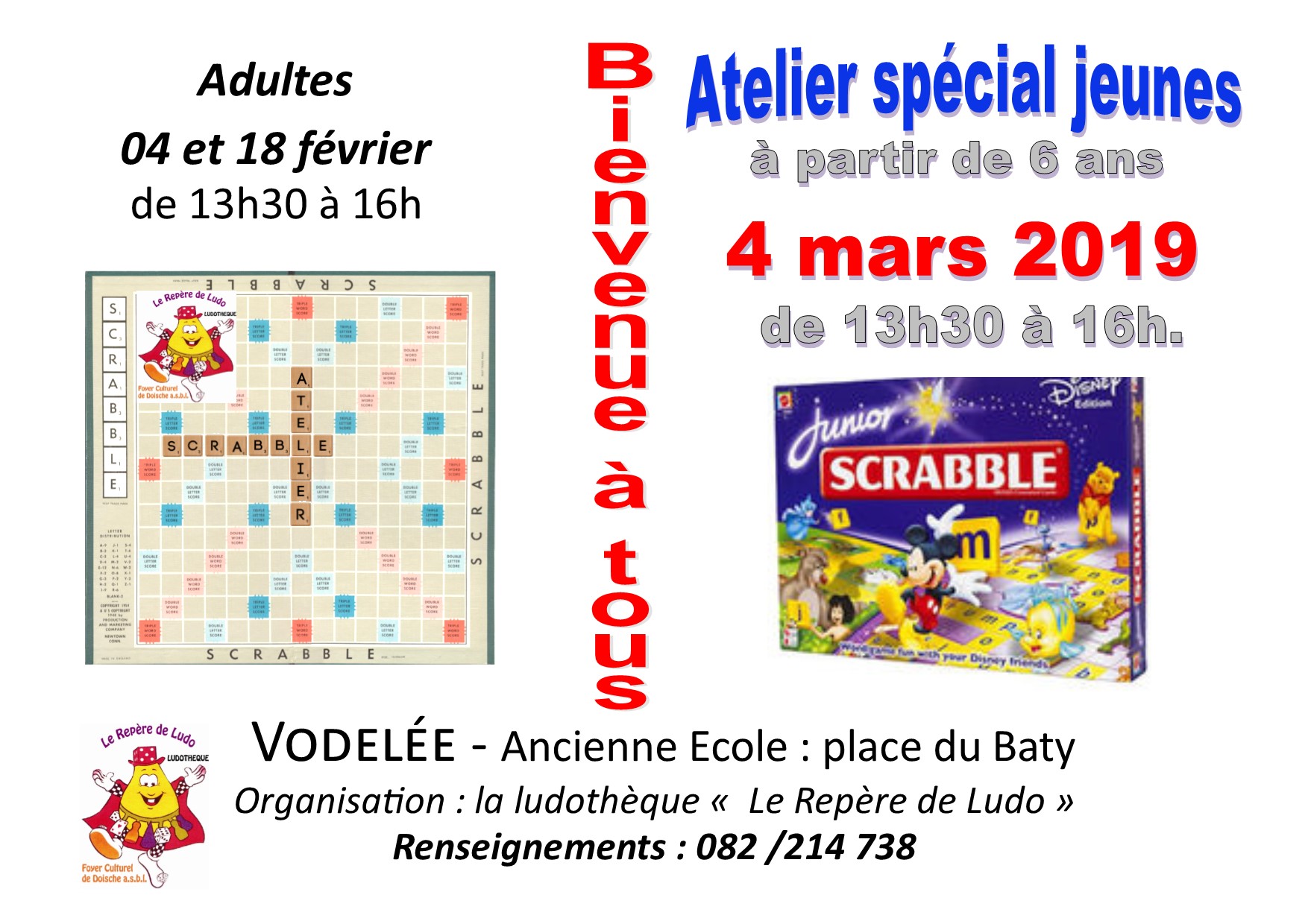 Atelier Scrabble adultes (4 et 18 février) – enfants (4 mars) Publié parscopienne15 janvier 2019Publié dansAnimations de Ludo, Ludothèque J’aime chargement… Sur le même thème Publié par scopienne Bibliothécaire-animatrice à la bibliothèque "Livre-Choix" du Foyer culturel de Doische Voir plus d’articles