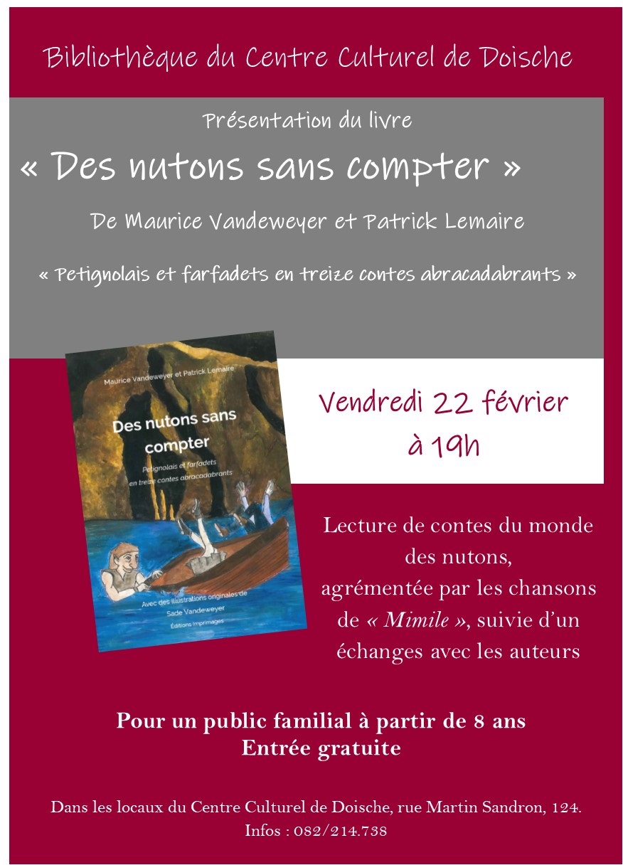 Présentation du livre « Des nutons sans compter » (le 22 février 2019) Publié parscopienne15 janvier 2019Publié dansBibliothèque J’aime chargement… Sur le même thème Publié par scopienne Bibliothécaire-animatrice à la bibliothèque "Livre-Choix" du Foyer culturel de Doische Voir plus d’articles