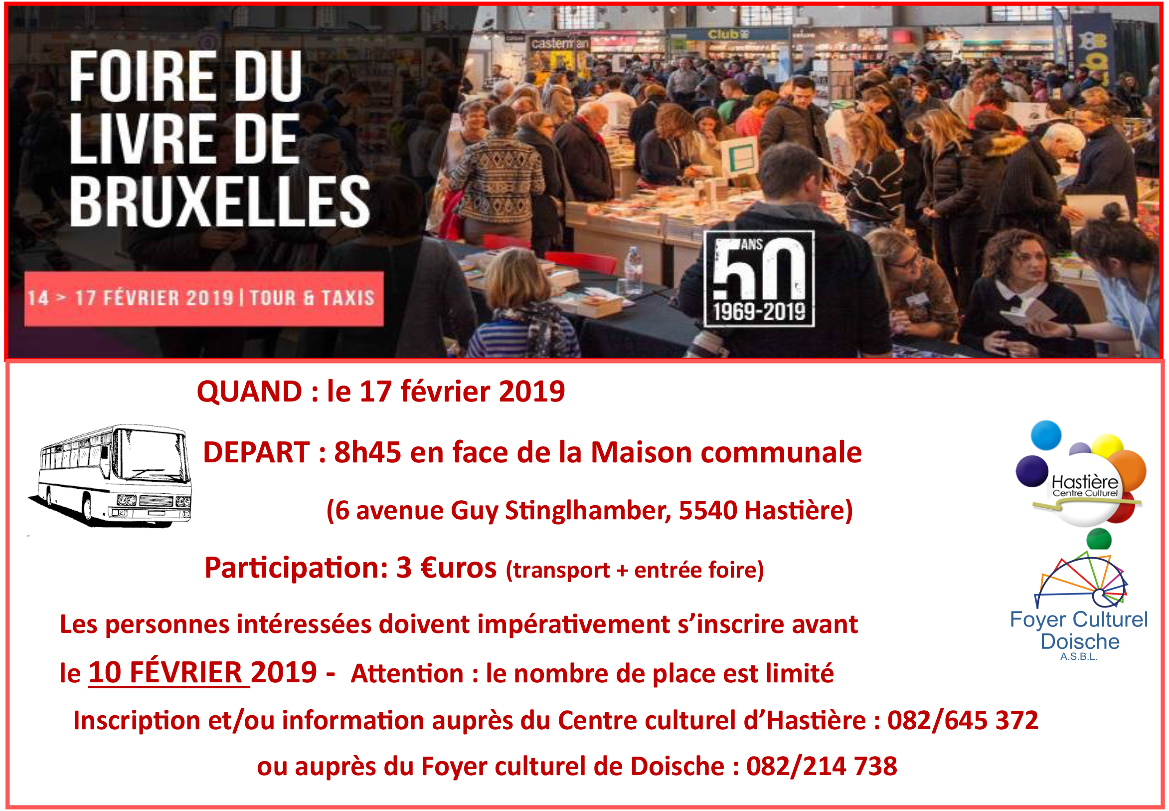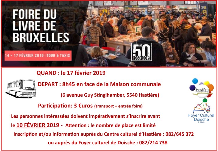 Transport collectif pour la Foire du Livre de Bruxelles (17/02/2019) Publié parscopienne25 janvier 201925 janvier 2019Publié dansBibliothèque J’aime chargement… Sur le même thème Publié par scopienne Bibliothécaire-animatrice à la bibliothèque "Livre-Choix" du Foyer culturel de Doische Voir plus d’articles