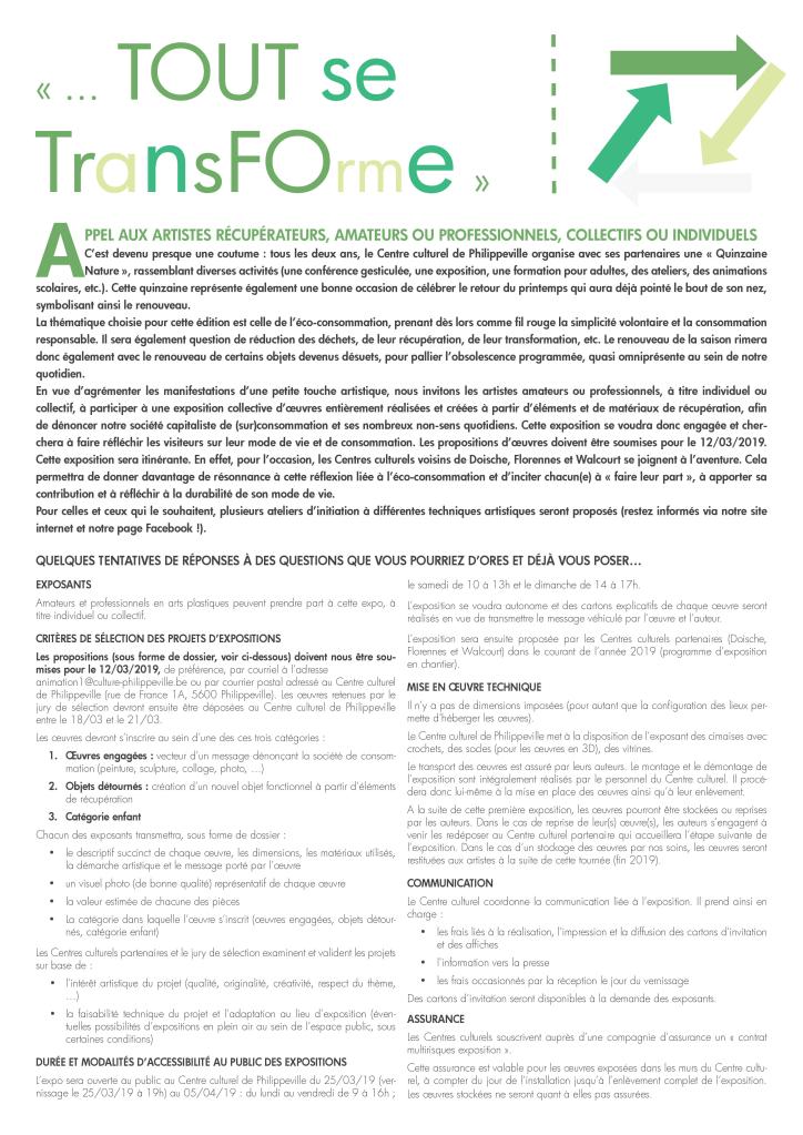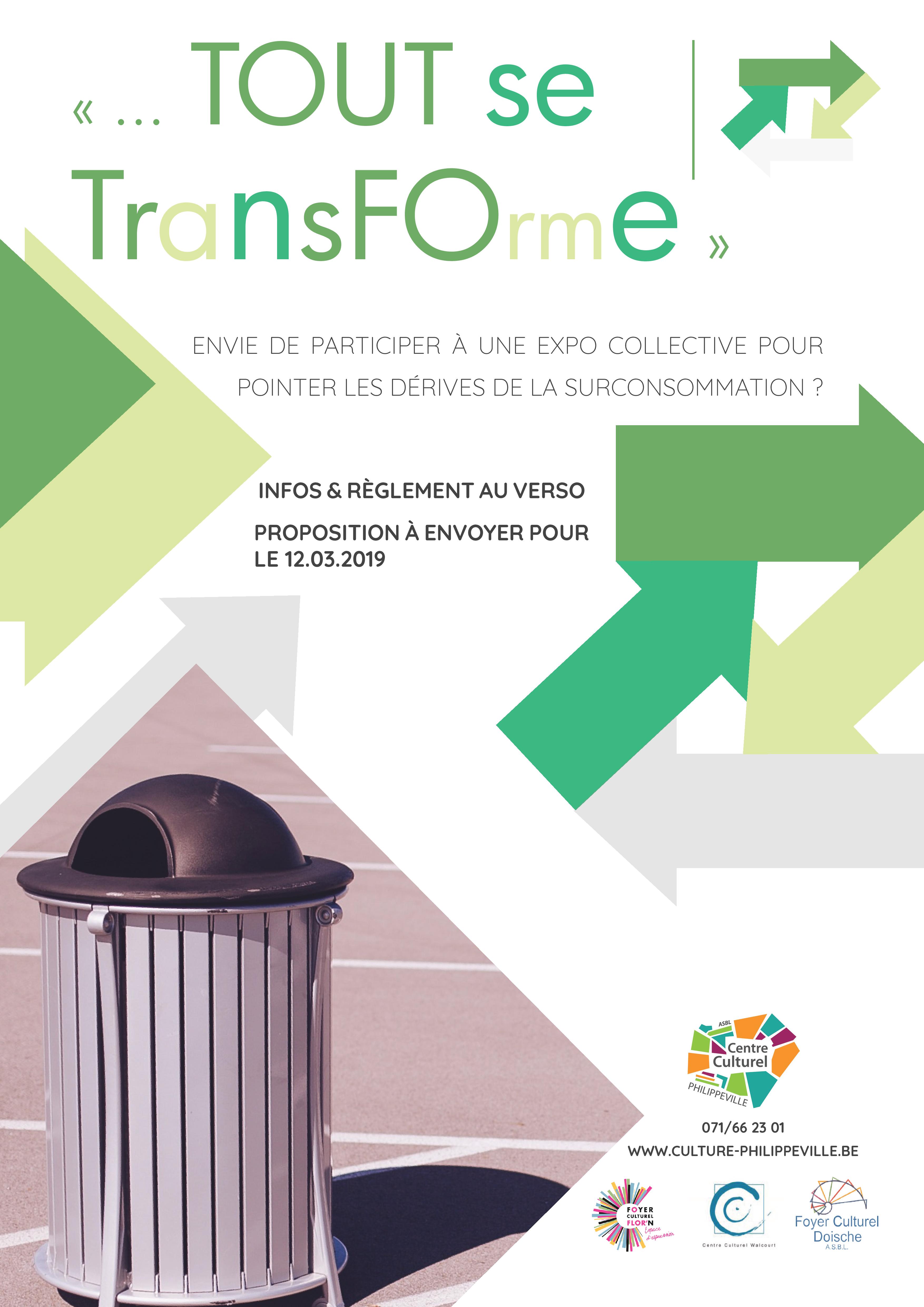 Appel aux artistes : « … Tout se transforme » (clôture le 12/03/2019) Publié parscopienne1 février 2019Publié dansCentre culturel, Expositions Cliquez sur l’image pour agrandir J’aime chargement… Sur le même thème Publié par scopienne Bibliothécaire-animatrice à la bibliothèque "Livre-Choix" du Foyer culturel de Doische Voir plus d’articles