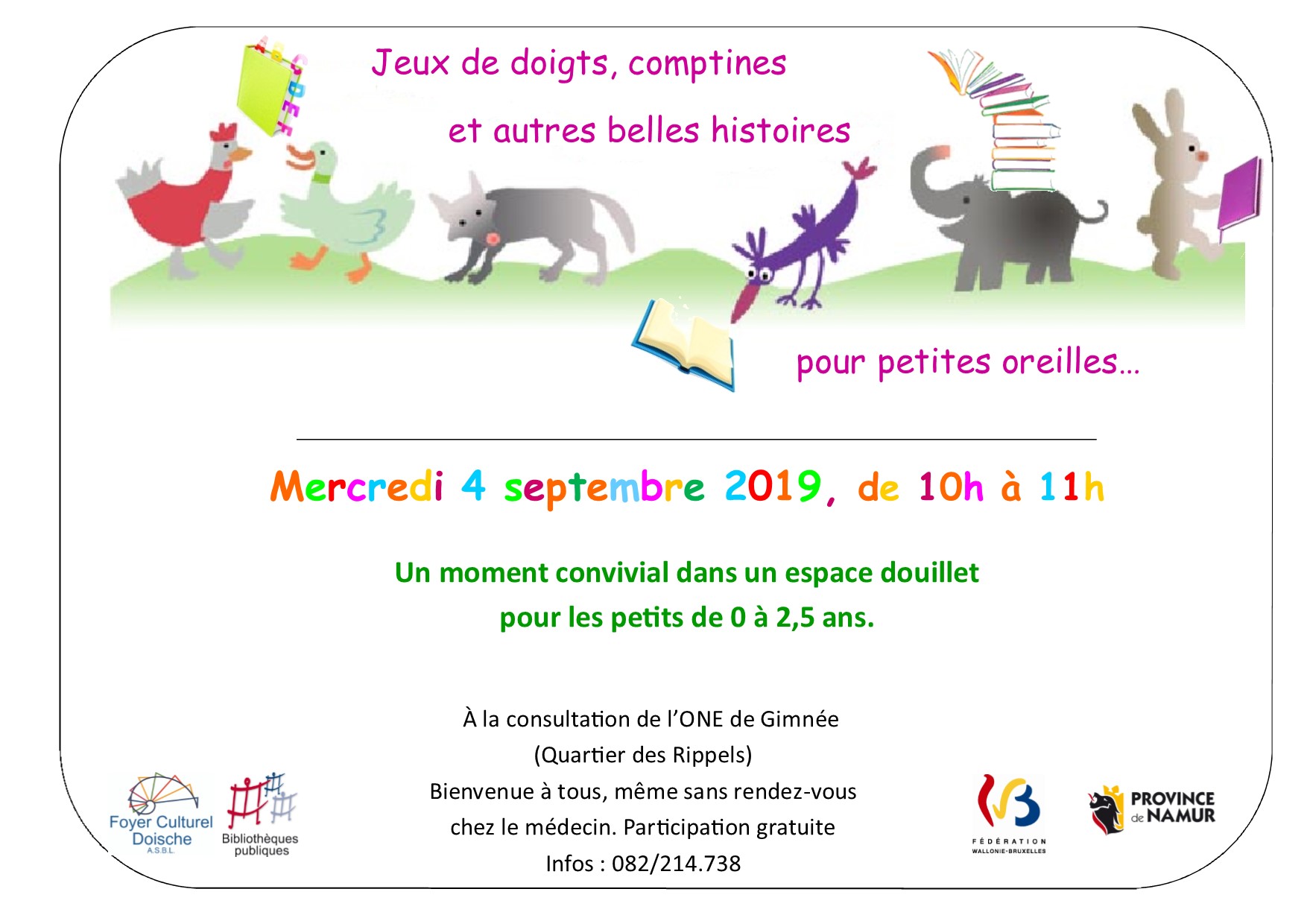 Jeux de doigts, comptines et autres belles histoires (04/09/2019) Publié parscopienne26 août 2019Publié dansAccueil Temps Libre J’aime chargement… Sur le même thème Publié par scopienne Bibliothécaire-animatrice à la bibliothèque "Livre-Choix" du Foyer culturel de Doische Voir plus d’articles