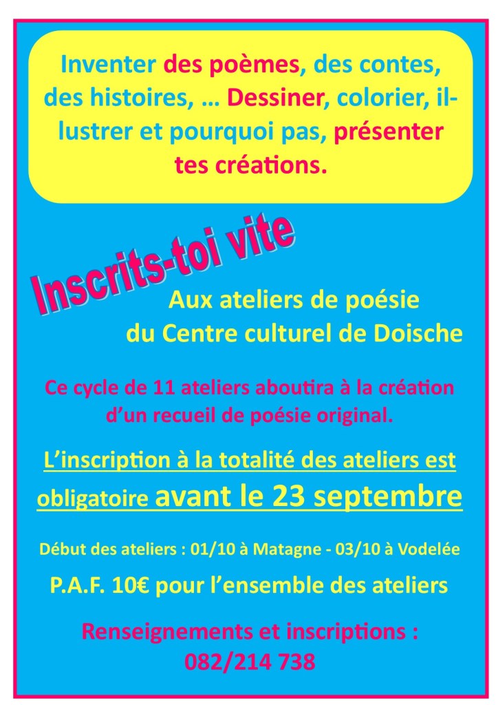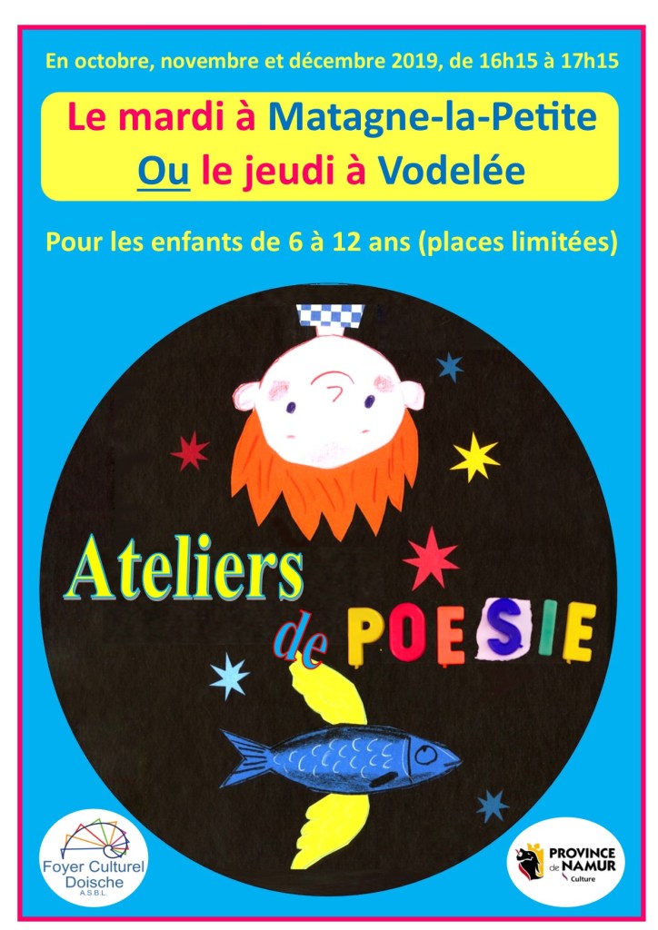 Ateliers de poésie (octobre à décembre 2019) Publié parscopienne2 septembre 20192 septembre 2019Publié dansAnimations, Évènements, Stages & Ateliers, Centre culturel J’aime chargement… Sur le même thème Publié par scopienne Bibliothécaire-animatrice à la bibliothèque "Livre-Choix" du Foyer culturel de Doische Voir plus d’articles