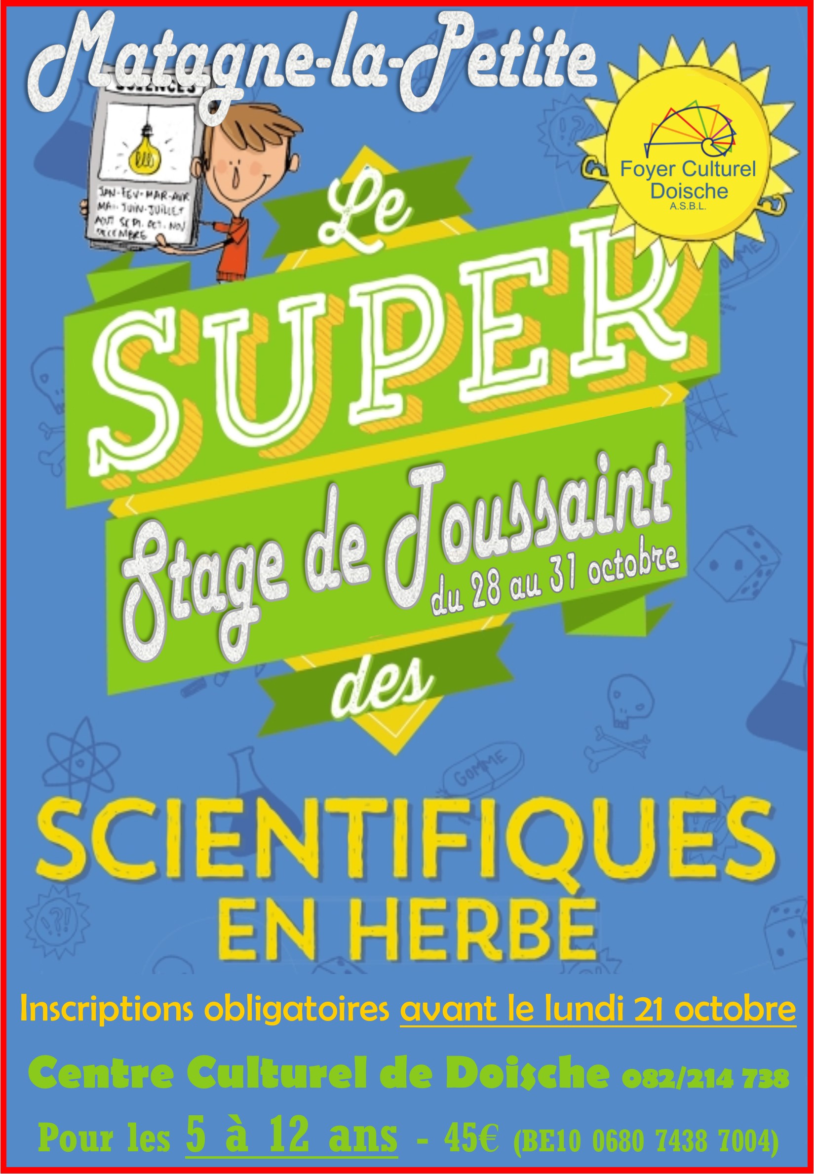 Le Super Stage de Toussaint des Scientifiques en Herbe (du 28 au 31 octobre 2019) Publié parCentre culturel de Doische3 octobre 2019Publié dansAnimations, Évènements, Stages & Ateliers, Centre culturel J’aime chargement… Sur le même thème