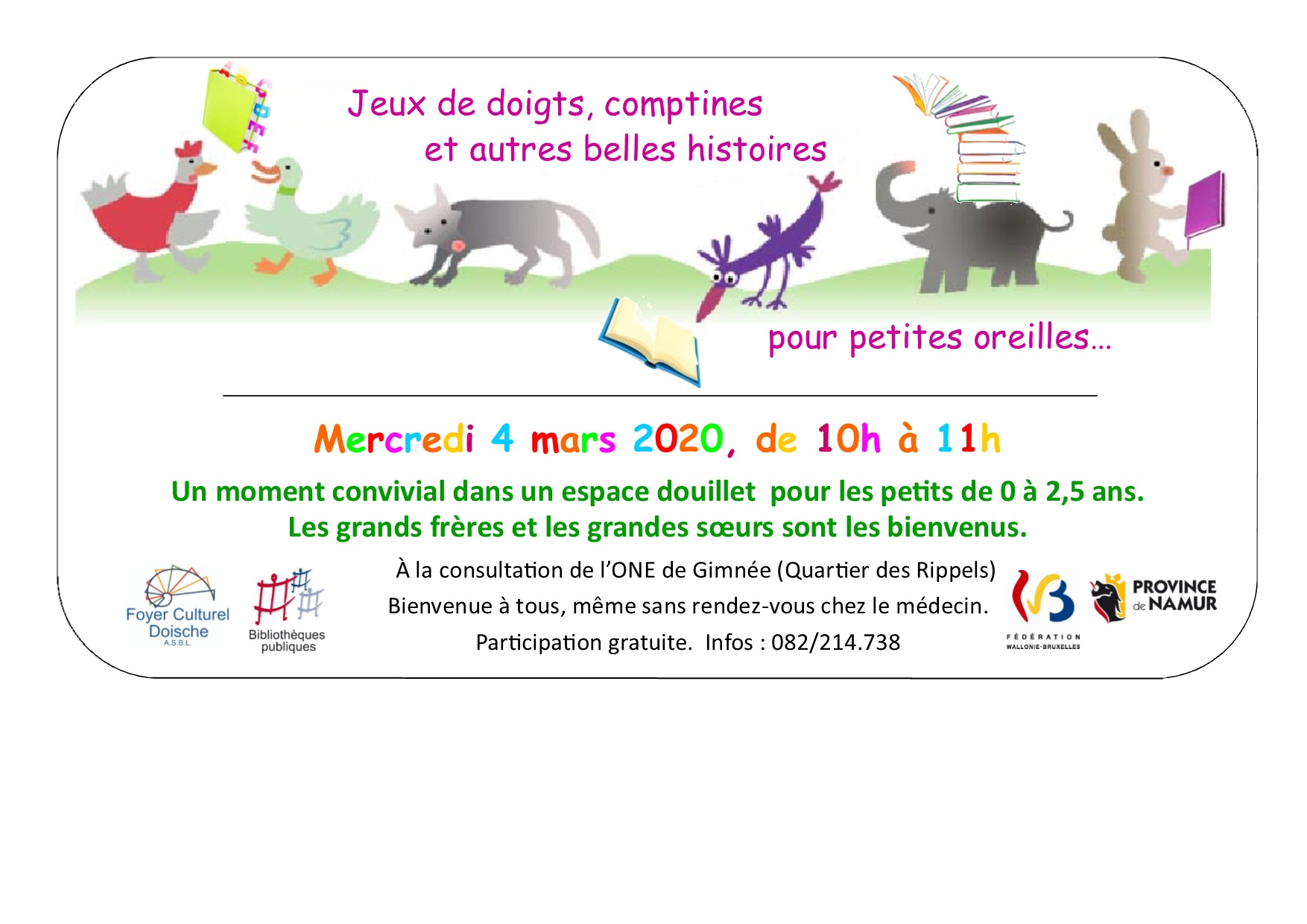 Jeux de doigts, comptines et autres belles histoires… (04/03/2020) Publié parCentre culturel de Doische17 février 2020Publié dansAccueil Temps Libre J’aime chargement… Sur le même thème