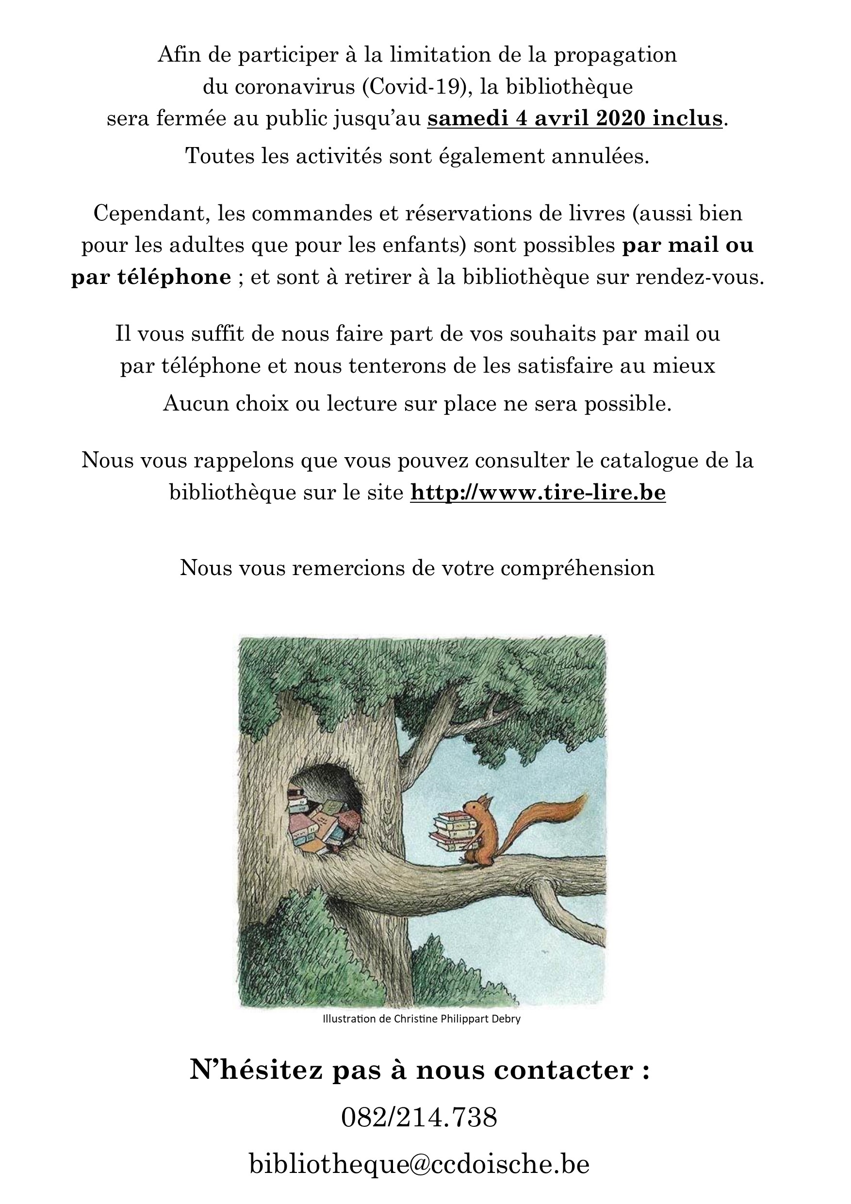 Fermeture de la bibliothèque jusqu’au 4 avril 2020 inclus Publié parCentre culturel de Doische16 mars 2020Publié dansBibliothèque J’aime chargement… Sur le même thème