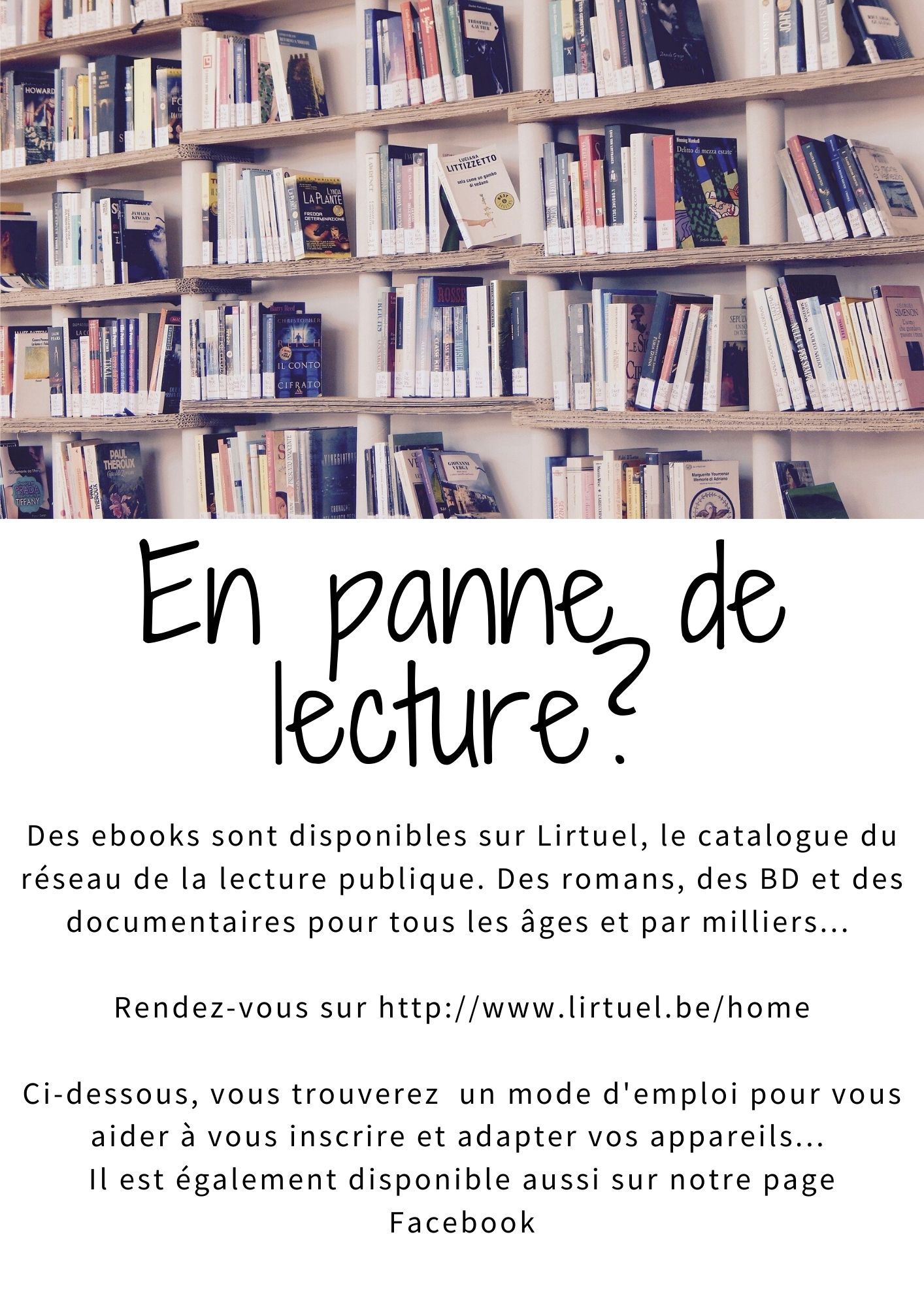 En panne de lecture pendant le confinement? On a une solution ! Publié parCentre culturel de Doische23 mars 2020Publié dansBibliothèque http://www.lirtuel.be/home Pour consulter le mode d’emploi pour vous aider à vous inscrire et adapter vos appareils, cliquez ici J’aime chargement… Sur le même thème