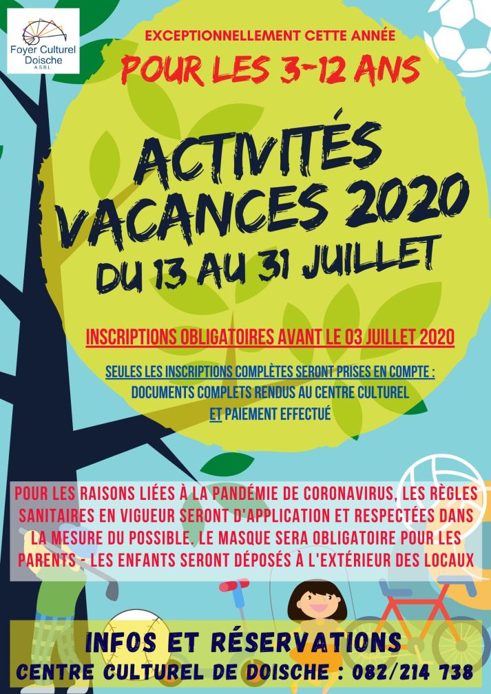 Activités Vacances : du 13 au 31 juillet 2020 Publié parCentre culturel de Doische5 juin 202022 juin 2020Publié dansCentre culturel Pour télécharger le projet pédagogique et le règlement d’ordre intérieur, cliquez ici Pour télécharger la fiche d’inscription, cliquez ici J’aime chargement… Sur le même thème