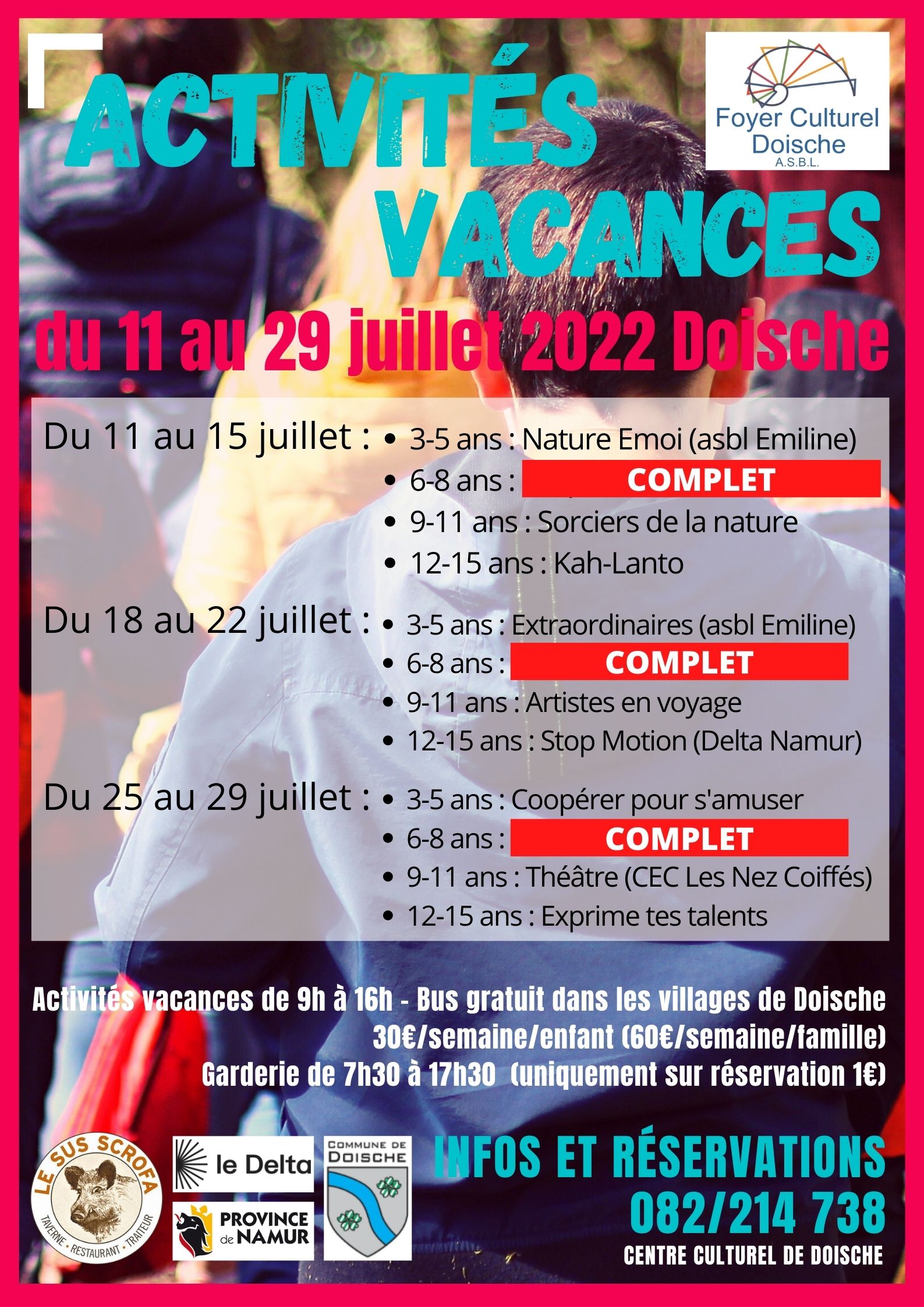 Les inscriptions pour les Activités Vacances sont ouvertes Publié parCentre culturel de Doische31 Mai 20228 juin 2022Publié dansCentre culturel Si vous désirez inscrire vos enfants aux activités vacances de juillet, n’hésitez pas à nous contacter au 082/214 738 J’aime chargement… Sur le même thème
